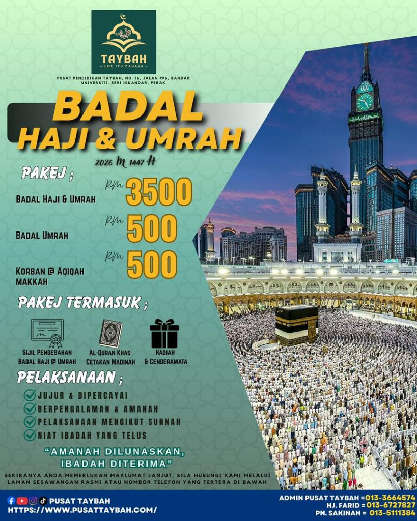 Badal Haji dan Umrah ini dikendalikan sepenuhnya oleh Pusat Pendidikan Taybah dengan komitmen untuk memberikan perkhidmatan yang terbaik, sah, dan dipercayai. Kami memastikan setiap urusan dijalankan dengan penuh tanggungjawab dan mengikut syariat Islam, bagi memberikan ketenangan dan keberkatan kepada pelanggan kami. Anda boleh yakin bahawa setiap langkah perjalanan haji dan umrah anda dipandu oleh pengalaman dan kepercayaan yang kukuh.